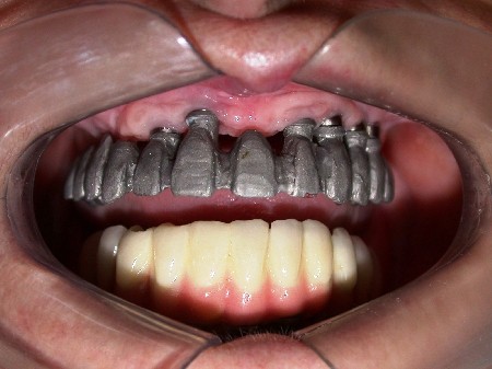 Estrutura sendo provada quanto sua adaptação sobre a plataforma dos Mini-Pilares. Temos que ter um assentamento passivo, sem tensões. Caso não exista este assentamento passivo teremos problemas de perda óssea e posterior perda do implante.
