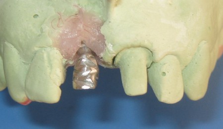 Figura 10. Vista frontal do munhão já preparado sobre o análogo incluído no modelo de gesso. Observe o espaço disponível para a construção das coroas protéticas.