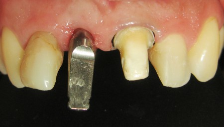 Depois de 4 meses da instalação do implante, foi realizada moldagem de transferência com munhão personalizável no implante 11 e preparo para coroa total no dente 21(FIG 7).