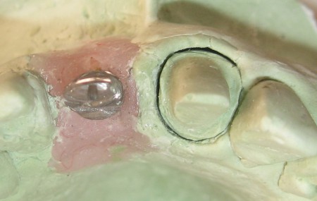 Figura 9. Vista incisal do munhão já preparado sobre o análogo incluído no modelo de gesso.